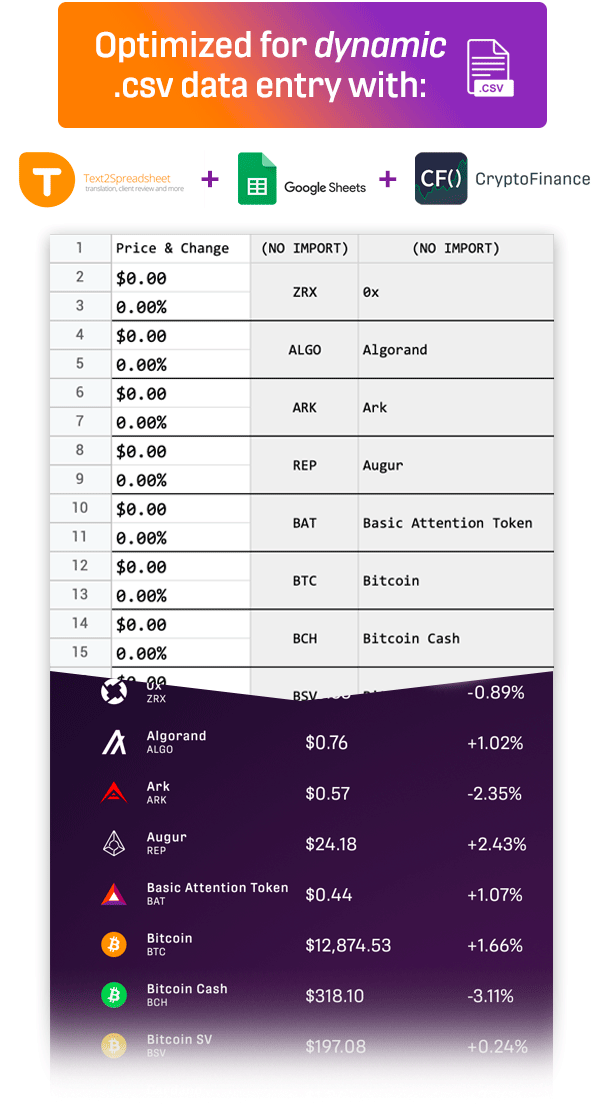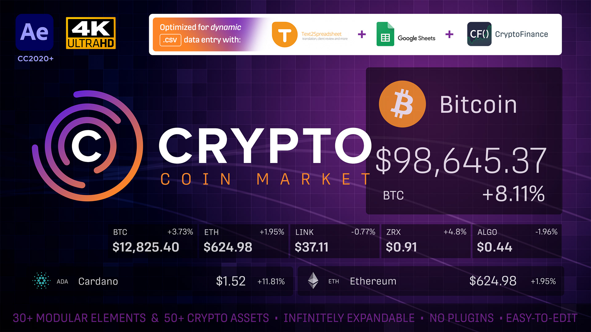 A vibrant, robust, and highly customizable After Effects graphics template featuring dynamic CSV data input specifically designed for tracking various cryptocurrency markets, coins, and tokens.
